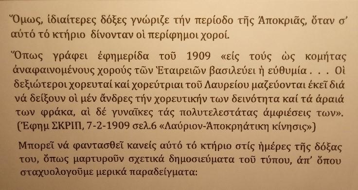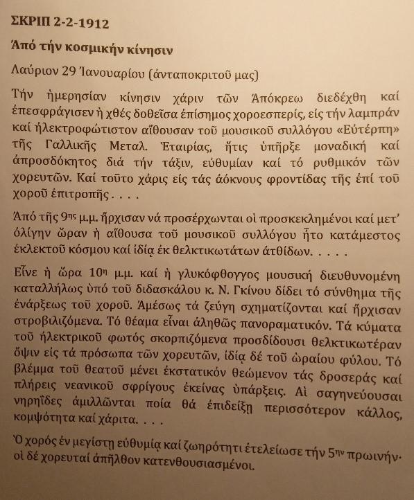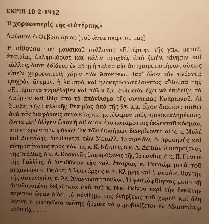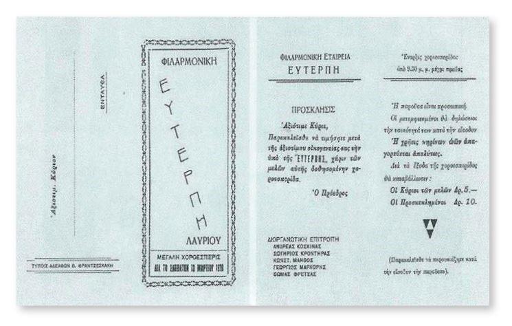 Ξακουστοί όμως ήταν και οι χοροί που διοργάνωναν οι μεταλλευτικές εταιρείες ή άλλοι φορείς της πόλης στο κτίριο της «Ευτέρπης» τη περίοδο της Αποκριάς. Από αναφορές σε δημοσιεύματα τύπου της εποχής, προσκλήσεις σε χοροεσπερίδες και προσωπικές μαρτυρίες που πέρασαν από γενιά σε γενιά, μπορούμε να σχηματίσουμε την εικόνα μιας κοσμοπολίτικης προπολεμικής κοινωνίας [π.18] όπου η μουσική, μέσω της φιλαρμονικής της «Ευτέρπης» είχε τον πιο σημαντικό ρόλο στο Λαύριο [π.19 & π.20] και όχι μόνο [π.21].