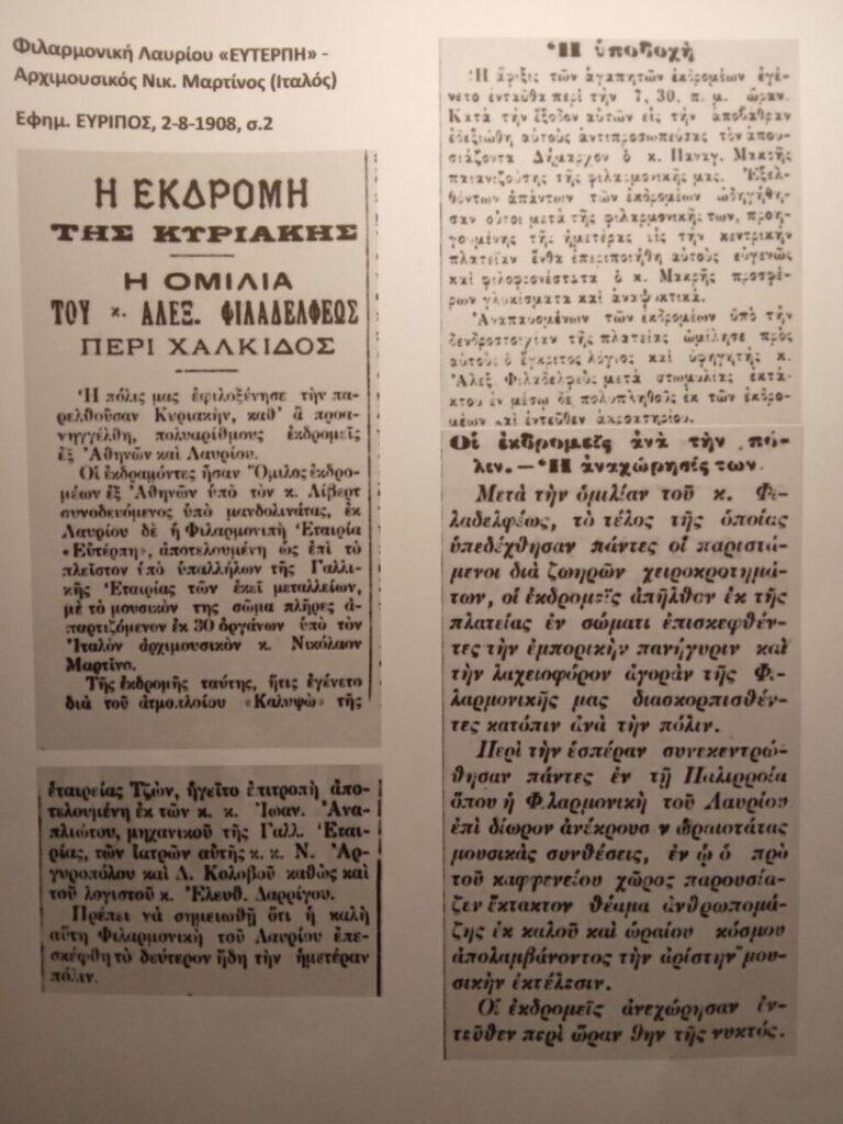 Ο Βασίλης (Βάσος) Δασκαλάκης (1897-1944) στο βιβλίο του «Οι ξεριζωμένοι» (Αθήνα 1930) που περιγράφει με μυθιστορηματικό τρόπο τη ζωή των μεταλλωρύχων – μεταλλοτεχνικών του Λαυρίου, στις αρχές του 20ου αιώνα, μας πληροφορεί πως: η φιλαρμονική του «Συλλόγου Φιλομούσων Λαυρίου», εκτός της συμμετοχής της στην Ολυμπιάδα του 1896 στη Αθήνα, είχε πάρει μέρος σε μουσικούς αγώνες στην Ιταλία μαζί με άλλες φιλαρμονικές και είχε έρθει μεταξύ των πρώτων (βλ. 1) ενώ συμμετείχε, με αρχιμουσικό τον Νικόλαο Βλάχο και υπαρχιμουσικό τον Σπυρίδωνα Μπέλικ, στην Ολυμπιάδα του 1906 στο Παναθηναϊκό Στάδιο της Αθήνας και μάλιστα βραβεύτηκε (βλ. 2). Το πρώτο βραβείο, συνεχίζει ο Β. Δασκαλάκης, δόθηκε στη φιλαρμονική της Κέρκυρας «Άγιος Σπυρίδων» (βλ. 3) με αρχιμουσικό τον Π. Καραβάνα (βλ. 4) και στους «δικούς μας» το δεύτερο (βλ. 5). Οι Λαυριώτες, έμειναν με την εντύπωση ότι έχασαν τη πρωτιά λόγο της φτωχής τους εμφάνισης που σαφώς υστερούσε μπρος στις φανταχτερές και χρυσοστόλιστες στολές των Κερκυραίων με τα εντυπωσιακά λοφία στα καπέλα τους λέγοντας ότι… «τους έφαγαν τα λοφία»!
