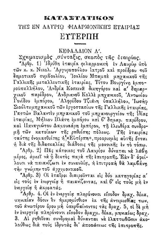 Από το ιδρυτικό ΦΕΚ της «Φιλαρμονικής εταιρίας Ευτέρπη» υπ. αριθμόν 224 Α 29/11/1893 σελ. 959 κεφ. Α’ πληροφορούμαστε πως το πρώτο Διοικητικό συμβούλιο απετέλεσαν οι κ.κ.: Νικόλαος Αργυρόπουλος – ιατρός και πρόεδρος του Δημοτικού Συμβουλίου, Ιούλιος Μπαμπέ – μηχανικός της Γαλλικής μεταλλευτικής εταιρίας, Τίτος Βουργίνης – εμποροϋπάλληλος, Ανδρέας Κοσκινάς – δικηγόρος και Α’ δημαρχικός πάρεδρος, Ανδριανός Κολλέ – μηχανικός, Αντώνιος Γονίδης – έμπορος, Αλφρέδος Τζιάνη – υπάλληλος, Ιωσήφ Σιούλτε – μηχανικός των εργοστασίων της Γαλλικής εταιρίας, Γαστών Βαλαντέν – μηχανικός του μηχανουργείου της ίδιας εταιρίας, Μήλιος Βλάσης – έμπορος και Β’ δημαρχικός πάρεδρος και τέλος, ο Παναγιώτης Δαμουκάρης – έμπορος.