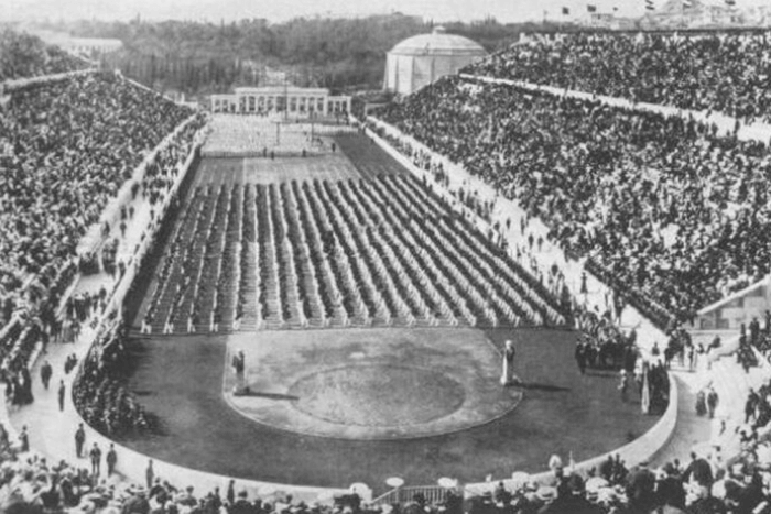 Στη πρώτη Ολυμπιάδα στην Αθήνα στις 25 Μαρτίου του 1896, συμμετείχαν οι μπάντες των Φιλαρμονικών εταιρειών και Συλλόγων: Κερκύρας (παλαιά), Κεφαλληνίας, Λευκάδος, Λαυρίου, Πύργου, Ζακύνθου, Πατρών, Αιγίου, και μια φιλαρμονική από την Κωνσταντινούπολη οι οποίες τοποθετήθηκαν από νωρίς πέριξ του σταδίου, παιανίζοντας κατά την άφιξη του κοινού, των επισήμων και κατά την είσοδο των αθλητών σε αυτό. Οι φιλαρμονικές στο τέλος εισήλθαν στο στάδιο παιανίζοντας από κοινού, καταλήγοντας στο κέντρο του στίβου και προκαλώντας δέος στους θεατές. Κάποιες εξ αυτών (όπως η Κερκυραϊκή) έδωσαν συναυλίες σε κεντρικά σημεία των Αθηνών την προηγούμενη μέρα και κατά τη διάρκεια των αγώνων.
